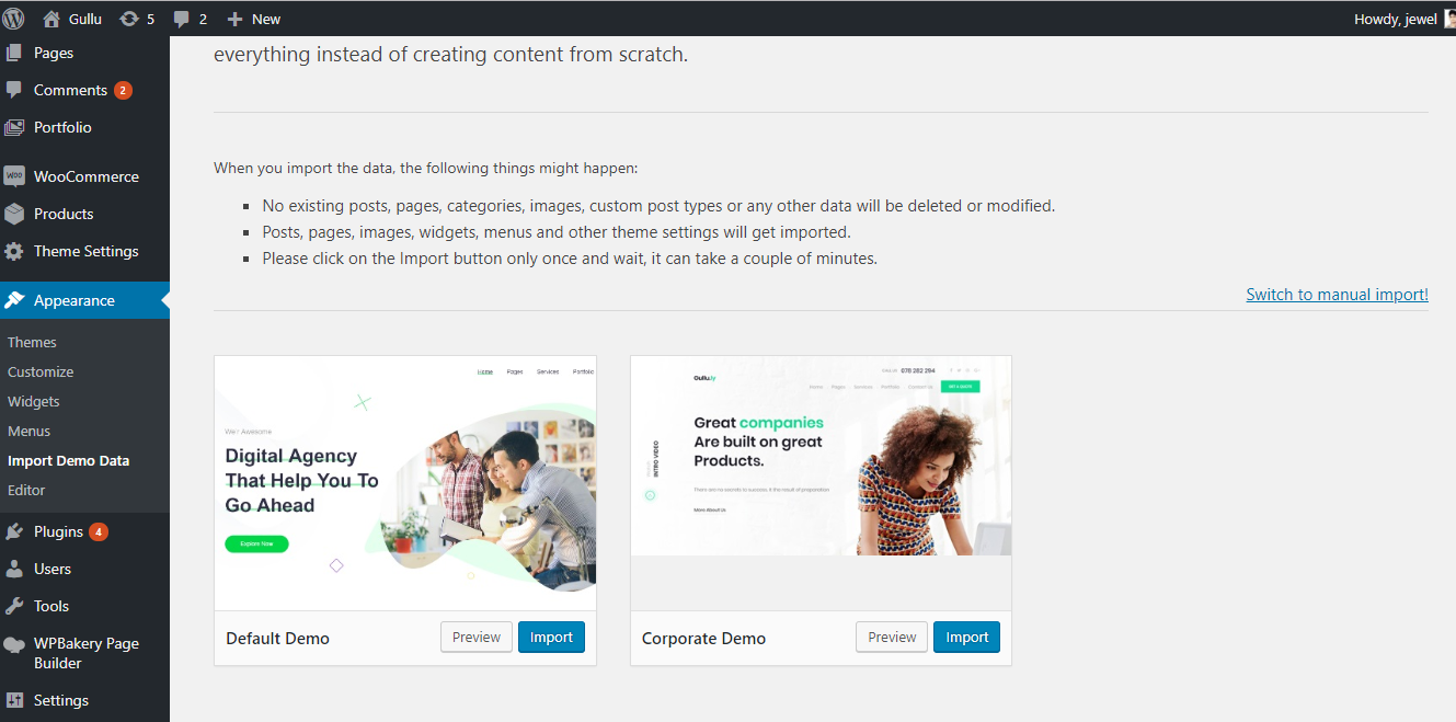 If you failed to import the demo content by one click then you have to follow the below steps to import the demo content manually. You will get all demo content data with the theme package. You will find the demos in ‘gullu>inc/demo{disired-demo-number} this path.