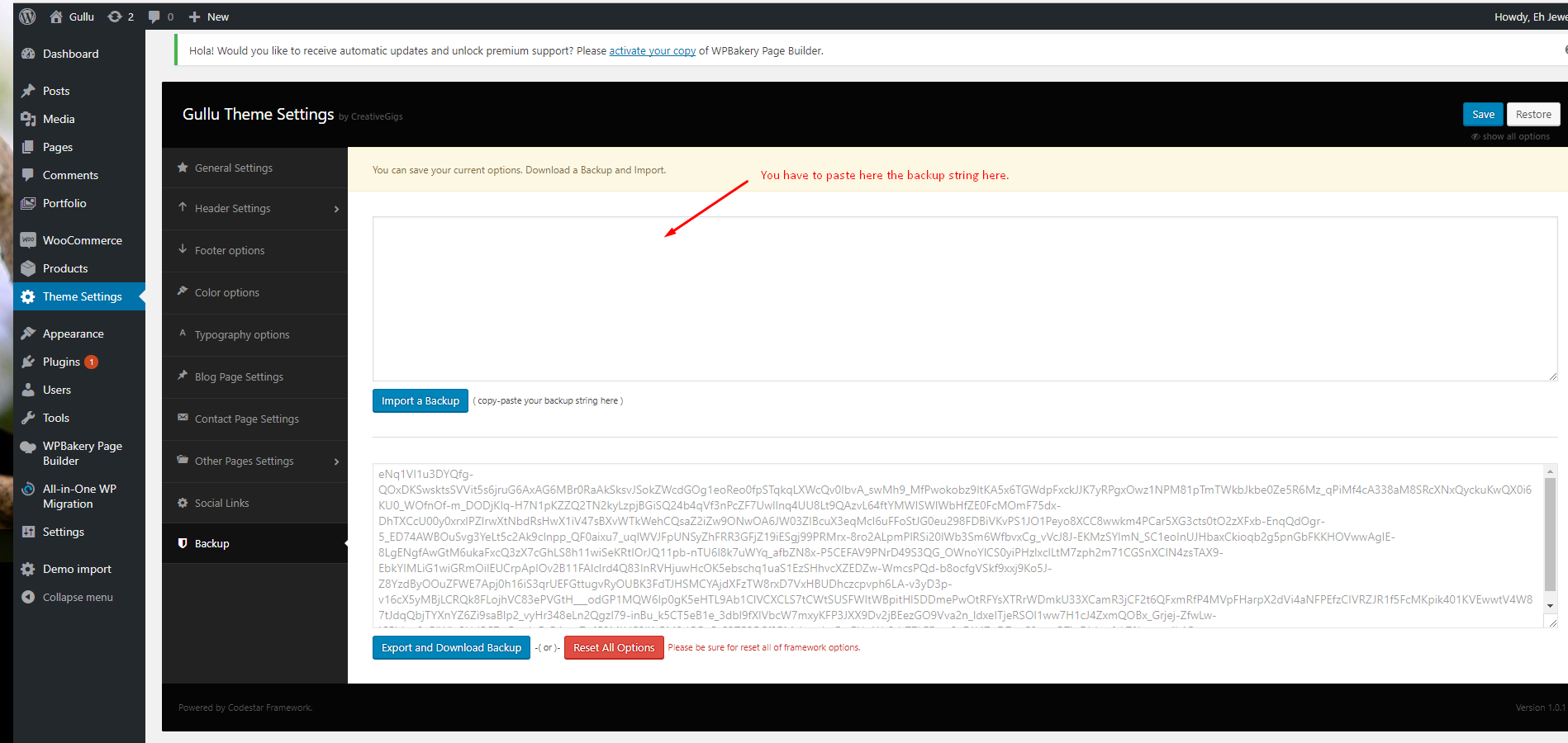 - Now you have to import the Dental Options as like the demo. Navigate to ‘Theme Settings > Backup’. Then copy-paste the backup string here and click on the Import a Backup button. You will find the backup string in the options.txt file.